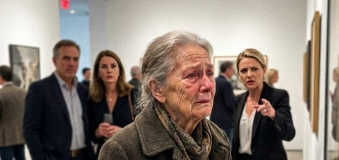 Jag släppte in en gammal kvinna som alla ignorerade — hon stannade framför en målning och viskade: ”Det är mitt liv”. Jag minns fortfarande hur hon stod vid