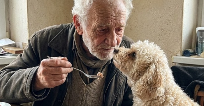 När jag var klar placerade jag hela tallriken framför den gamle mannen och böjde mig ner för att ställa tallrikarna på golvet. Hunden tittade på mig som om jag vore en trollkvinna.