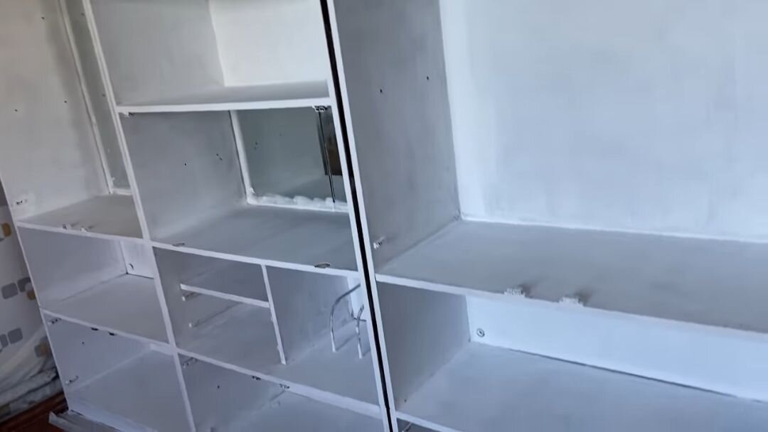 Arbetet började med att skåpet monterades isär helt. Handtagen togs bort, dörrarna lyftes av och hyllorna plockades ut. På så sätt blev alla ytor lättare att komma åt för det fortsatta arbetet.