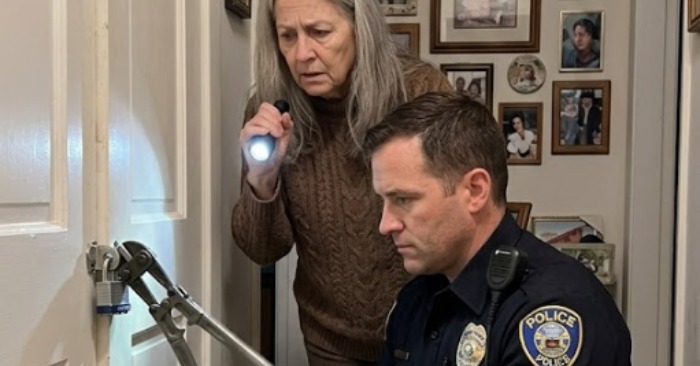 På utsidan satt ett tjockt industriellt hänglås. Det var inte ett litet vanligt lås, utan ett nytt, kraftigt sådant, fastsatt på en ny monterad hasp. Skruvarna såg nya ut, och träet runt dem var ljust och färskt.