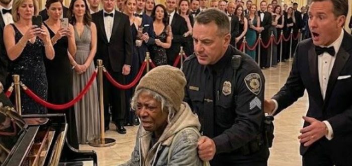 En bräcklig, hemlös svart kvinna var på väg att ledas ut av två kraftiga säkerhetsvakter från en lyxig välgörenhetsgala. Hennes blick fastnade på flygeln som stod mitt i